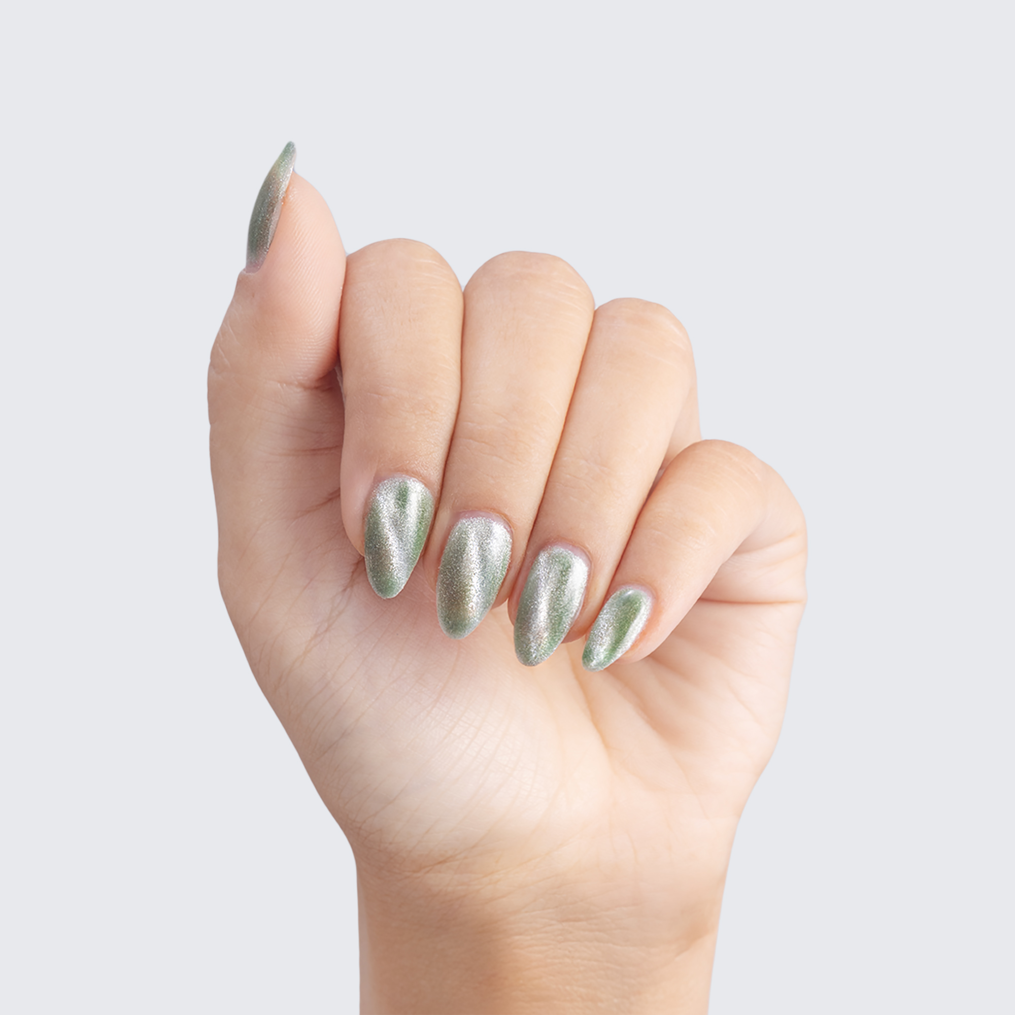 Sage green. Medium-dark. Silver magnetic shimmer. Opaque. Cool undertone.
